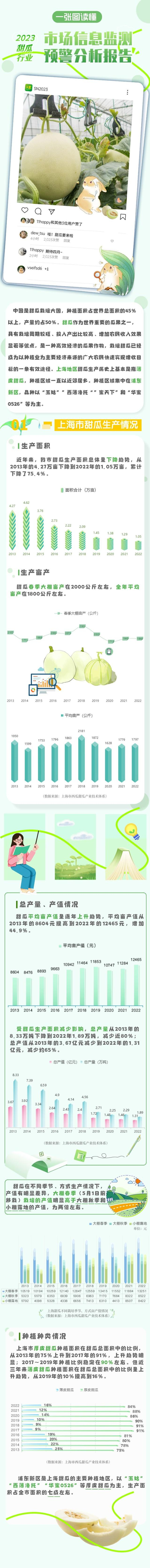 市农业农村委介绍,近日,首批特早熟地产甜瓜上市了。上海有多少甜瓜?有什么品种?销售价格怎么样?上海市农产品(瓜果)全产业链市场信息监测预警分析团队日前公布了《上海市甜瓜行业2023年市场信息监测预警分析报告》,一起来看看吧↓