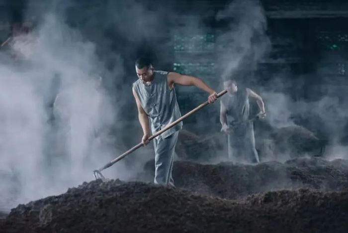 在酿制过程中,工人将母糟从窖池中起运出来,堆砌成四方形,铺上糠壳,避免挥发。