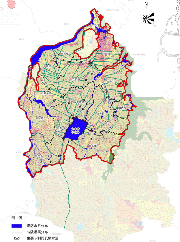 芍陂灌溉工程系统主要包括蓄水工程、环塘水门、灌排渠系及配套设施、防洪工程四大部分。