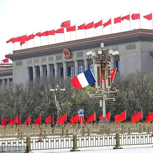 2023年4月6日,北京,天安门广场悬挂中国和法国两国国旗。图/视觉中国