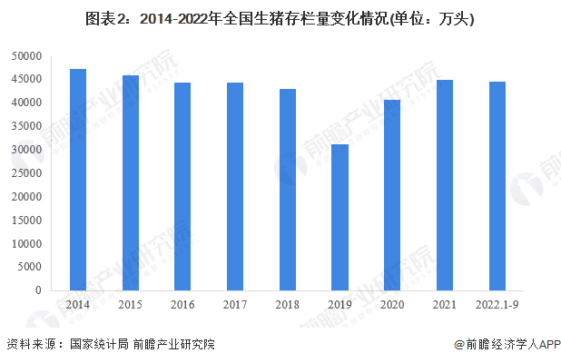 据国家统计局统计数据显示,2014年以来,我国生猪存栏量整体呈现下降趋势,自2018年8月首次爆发非洲猪瘟以来,疫情迅速在全国范围内蔓延,导致生猪产能下降,全国生猪存栏量进一步加速下降。据国家统计局数据显示,截至2019年12月,国内生猪存栏31040.7万头,同比下降27.5%。2020-2022年,中国生猪存栏量回升,2021年,全国生猪存栏量为44922万头;截至2022年9月末,2022年,全国生猪存栏量为44394万头。
