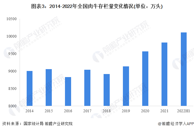 据国家统计局统计数据显示,2014年以来,我国肉牛存栏量整体呈现震荡趋势,总体维持在9000万头上下波动。据国家统计局数据显示,截至2019年12月,国内肉牛存栏9138.3万头,同比增长2.5%。2021年,全国肉牛存栏量为9817万头,同比增长2.7%。2022年上半年,全国牛存栏10111万头,比上年同期增加332万头,同比增长3.4%;比第一季度末增加227万头,环比增长2.3%,存栏数首次突破亿头。