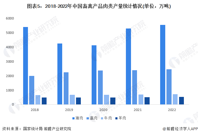 从中国畜禽产品肉类产量统计情况来看,2018-2022年,中国畜禽产品肉类产量总体呈增长趋势。2022年,全年猪牛羊禽肉产量9227万吨,比上年增长3.8%;其中,猪肉产量5541万吨,增长4.6%;牛肉产量718万吨,增长3.0%;羊肉产量525万吨,增长2.0%;禽肉产量2443万吨,增长2.6%。