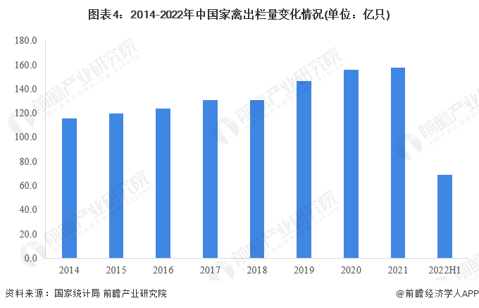 近年来,我国家禽业克服禽流感疫情对家禽生产、市场消费以及进出口贸易产生的负面影响,仍然保持平稳的发展态势。2019年家禽产品价格持续上涨,养殖效益向好,家禽饲养规模持续扩大。2019年全国家禽出栏146.4亿只,比上年增加15.51亿只,增长11.9%。2021年末,全国家禽存栏67.9亿只,比上年末增加0.1亿只,增长0.1%,近4年来最高。2022年上半年,全国家禽出栏69.1亿只,比上年同期下降0.7%。