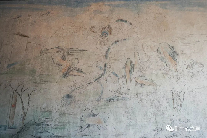 为了保护文物安全,都龙王庙内没有安装任何光源。主殿内两幅推测绘制于清末民初的壁画最为珍贵。邢军介绍,壁画的内容讲述了天气大旱,井水枯竭,老百姓寻龙找水的故事。基于梁架结构情况,两侧壁画前高后低,前高2.4米,后高2.15米,通长9.7米。可惜的是,主殿西墙北部以及东墙南部的部分壁画,曾因屋顶年久失修漏水被冲泡缺失。