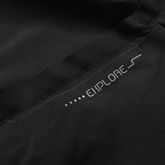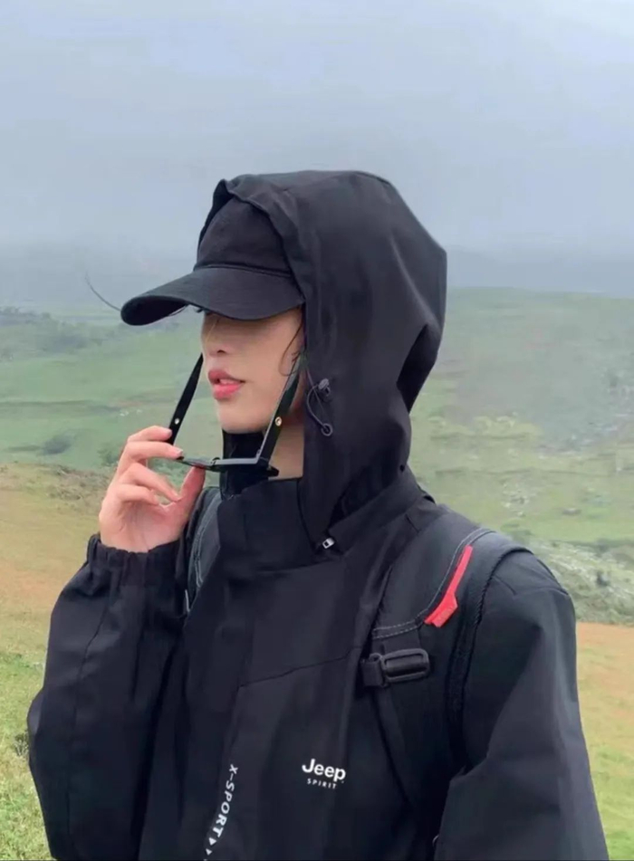 冲锋衣上的帽子做了抽绳设计,佩戴的时候可以自由调控头围大小。