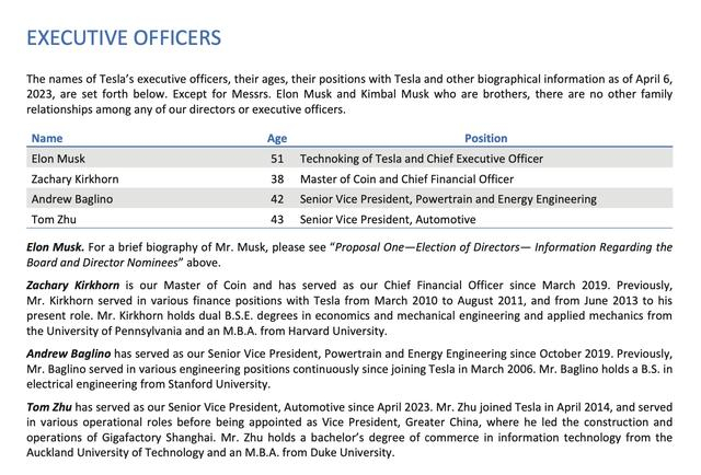 除此之外,这份委托书中最受我们关注的便是列出的四名高级管理层,首先是特斯拉CEO - Elon Musk(埃隆·马斯克),其次是CFO - Zachary Kirkhorn(扎克·柯克霍恩),然后再是负责动力和能源工程的高级副总裁Andrew Baglino(安德鲁·巴格里诺),而汽车高级副总裁的朱晓彤则是排在第四位。