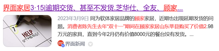 《逾期交货、甚至不发货,芝华仕、全友、顾家产品成投诉重点》,界面新闻