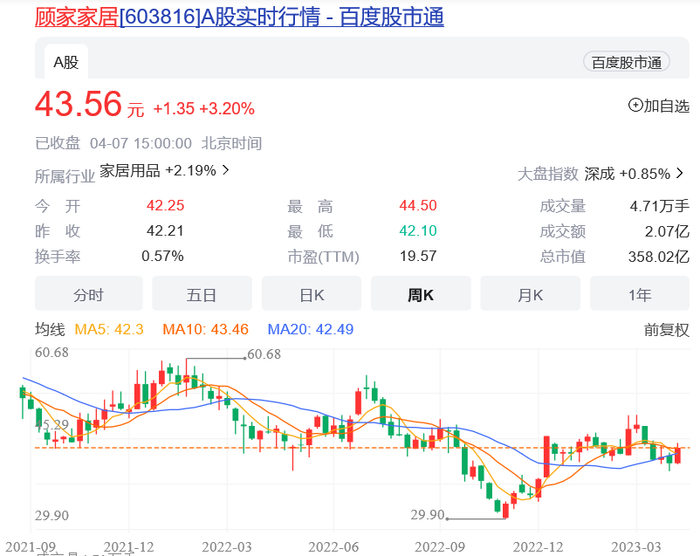 单论市值而言,截止2023年4月7日收盘,A股市值358亿元的顾家家居要比居然之家(290亿)、美凯龙(237亿)高出不少;