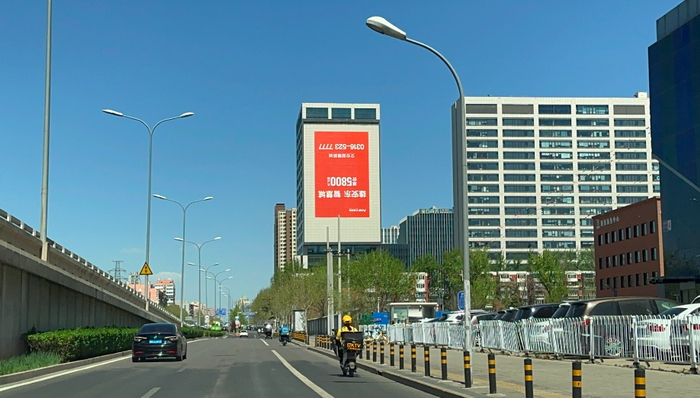 昨天,记者由南向北经过榴乡路,离着很远就注意到路东的大楼上有一块巨幅红色广告。走近后,记者发现整面广告牌是上下颠倒的,所以上面的字也是倒着的,上面写有“雄安东智慧城”等字样,下方还有一串联系电话。