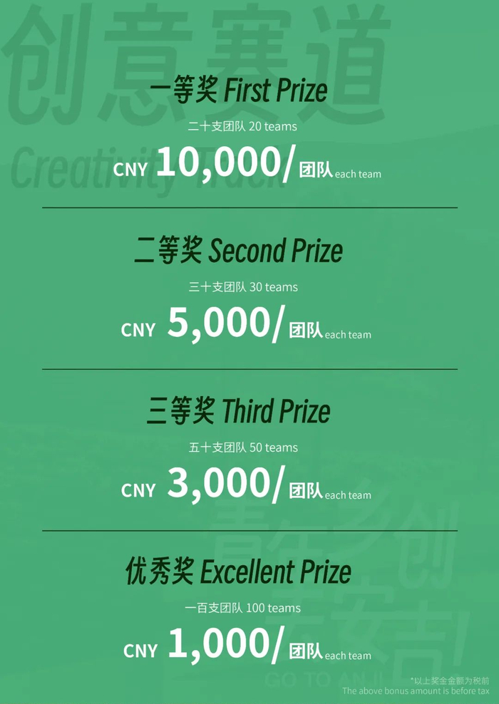 For the Creativity Track: The finalist team for the last round (200 teams) will be subsidized by RMB 2,000 (pre-tax) for survey.