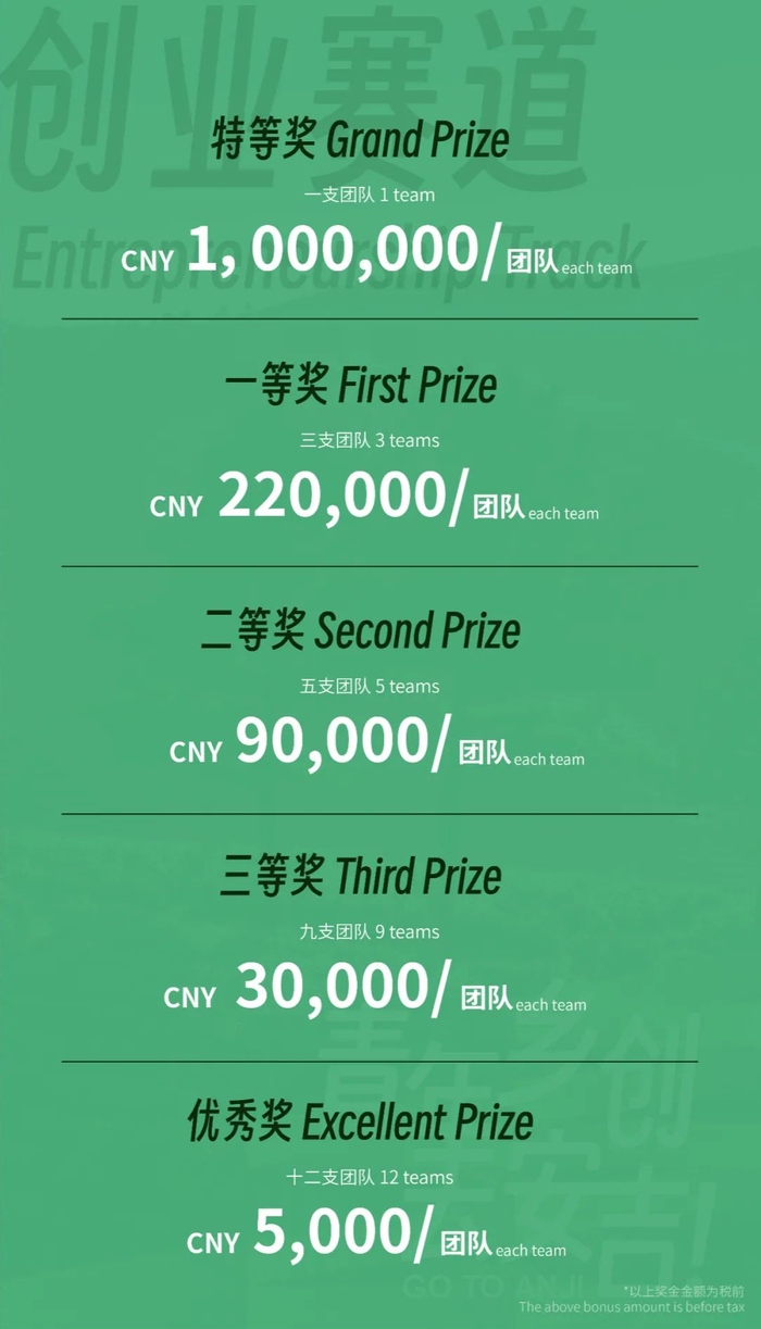 For the Entrepreneurship Track: The shortlisted team (30 teams) will be each subsidized by RMB 7,000 (pre-tax) for settlement in the village.