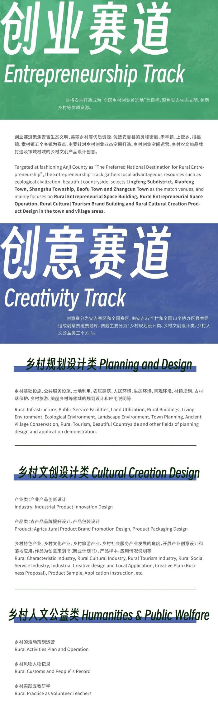 创意赛道分为安吉赛区和全国赛区。安吉赛区由安吉全域15个乡镇(街道)优选的27个村组成,全国赛区由13个协办区县20个村组成。从「乡村规划」、「乡村文创」和「人文公益」三个方面对乡村基础设施、公共空间环境提升,乡村文化的在地生长等方向开展创意设计并落地执行。