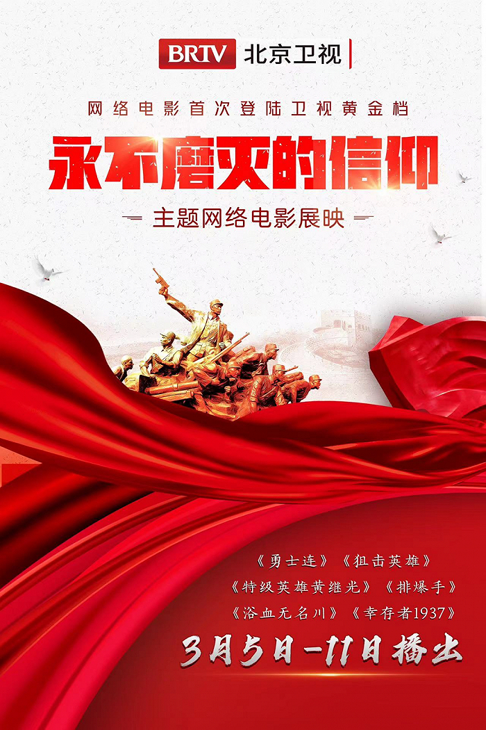 2023年3月,在全国两会重要宣传节点,《勇士连》《狙击英雄》《浴血无名川》《特级英雄黄继光》《排爆手》《幸存者1937》六部网络电影,以“永不磨灭的信仰”为主题,在北京卫视黄金时段展播,这是网络电影首次登陆卫视黄金档。