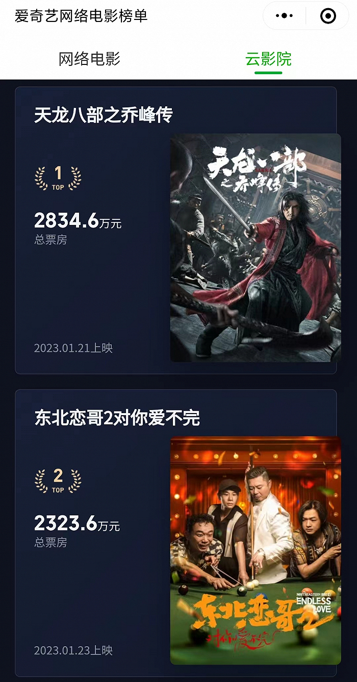 事实证明,这是值得的。这些在春节档上线的影片,不管是普通网络电影还是云影院影片,总票房全部都突破了1000万,无一例外。其中,《天龙八部之乔峰传》点播期单爱奇艺一家平台,票房便突破1500万;《东北恋哥2对你爱不完》点播期也解锁了千万票房,高于第一部的付费成绩。而得益于“云影院首映”模式较长的分账周期,春节档上线的这些影片目前票房仍在持续增长。