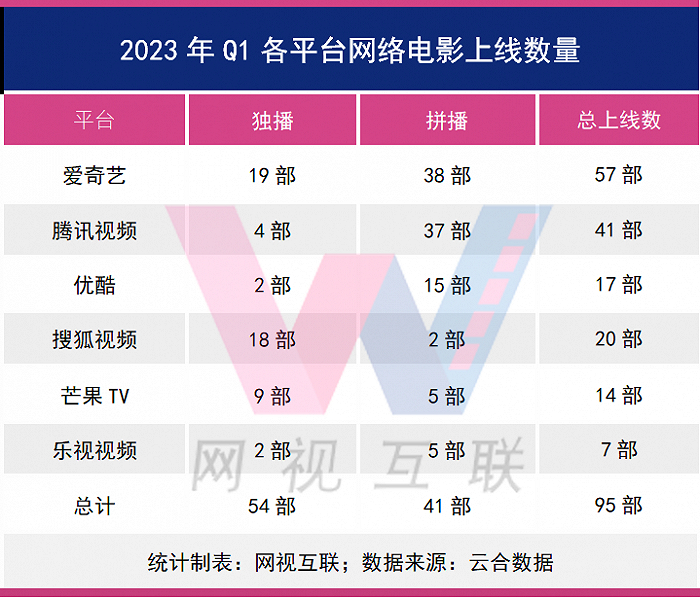 其中爱奇艺独播上线19部,拼播上线38部,总上线数高达57部,占Q1总上线影片的60%,依然是网络电影的播出大户。