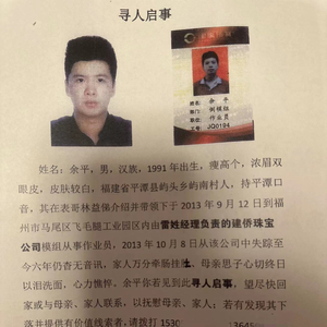 2013年9月,22岁的余平告别家人来到福州马尾区打工。上班一个月不到,10月8日,林珠钦接到儿子失踪的通知。之后的时间,林珠钦和家人四处张贴寻人启事,寻找余平下落。