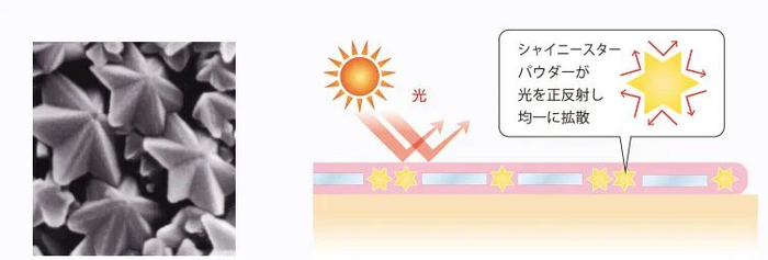 这款蜜粉饼的粉末构造非常特殊,由六芒星形状的“星状粉末”和表面光滑的“板状粉末”构成。