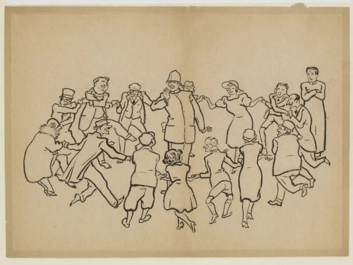 这幅素描描绘了乔治五世国王银禧庆典期间,狂欢者们将一名警察拉进他们围起的圆圈中舞蹈。蒋彝在这幅素描中也画出了他自己(最右),他身着中国长袍,饶有兴致地看着这一幕。