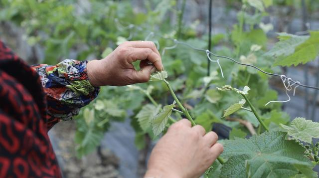 “这段时间是葡萄管理的关键期,对今年收成起着决定性的作用。最近温度回升得快,枝芽进入了快速成长阶段。”浦在良一边将过长的藤蔓芽掐掉,一边介绍道,“一旦开了花,葡萄就会进入快速生长期,如果不及时剪枝,疏穗的话,就会‘争夺’掉葡萄本身的养分,影响葡萄品质,你看这些藤蔓就长得过高了,如果不掐掉,这些养分就会往上跑,把头掐掉后营养就集中到葡萄的身上”。
