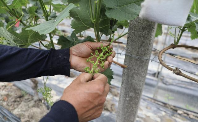 “葡萄修剪,每穗留果40到60粒最合适。”浦在良从2002年开始种植葡萄,对于葡萄种植有着丰富的经验,他一边说着一边展示起了刚刚进行疏花的一串果穗,“这个就是刚刚处理过的,这一串没有修过的花穗太大了,果粒又密又多,提早疏花可以使果穗坐果越紧,经过疏花后的果粒数就会减少很多。后续为了实现穗型整齐、颗粒均匀的葡萄品质还会根据各个大棚葡萄开花时间,分批进行适量保果”。