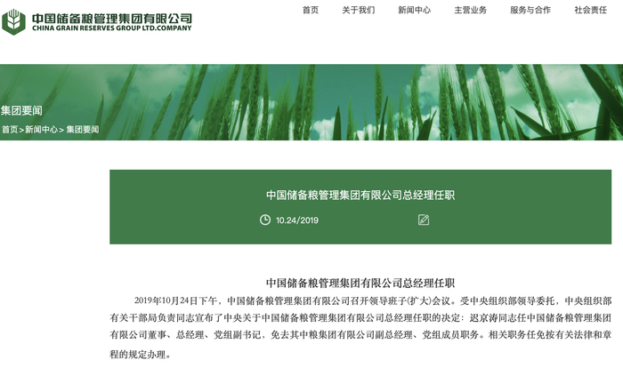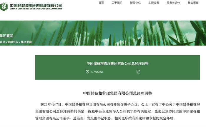 4月7日,按照中央企业领导人员任职年龄有关规定,免去迟京涛同志的中国储备粮管理集团有限公司董事、总经理、党组副书记职务。