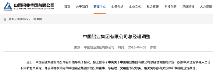 4月8日,按照中央企业领导人员任职年龄有关规定,免去刘祥民同志的中国铝业集团有限公司董事、总经理、党组副书记职务。