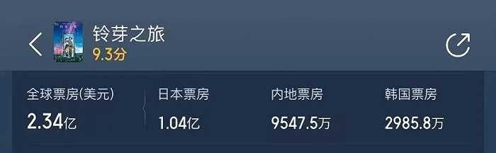 值得一提的是,《你的名字》全球票房达到3.83亿,其中日本本土票房2.33亿美金,韩国票房4799.5万美金,这都高于《铃芽之旅》;《铃芽之旅》在日本是2022年底上映,本土市场票房1.04亿,韩国票房2985万,全球票房2.34亿美金……