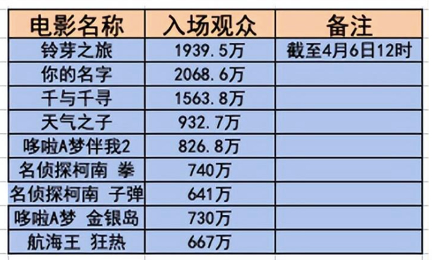 读娱君统计了在国内上映的日漫电影的观众人数,超过千万的只有三部,分别是《你的名字》《铃芽之旅》和《千与千寻》;其他,如《柯南》系列以及《哆啦A梦》系列虽然受众广泛影响力巨大,可仍未形成观影热潮。