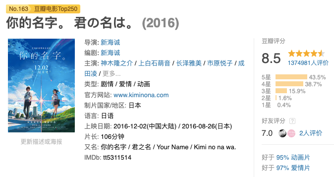 还是以豆瓣的数据为例,《你的名字》的想看人数24万,《铃芽之旅》想看11.6万——不知道是热衷上豆瓣打分的用户数量锐减了,还是《铃芽之旅》的热度可能也没有那么高。