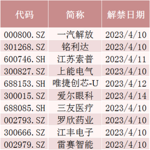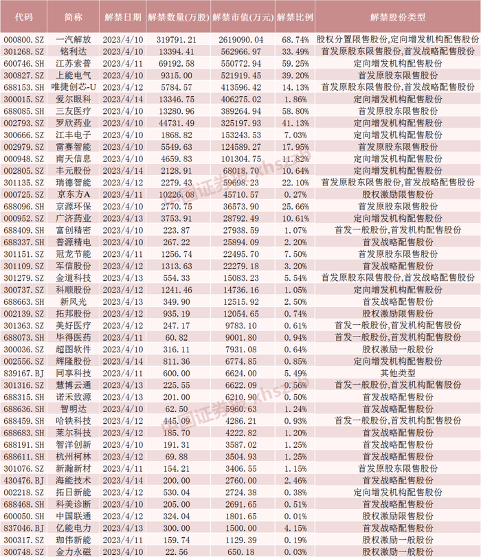 具体来看,Wind数据显示,一汽解放4月10日将解禁31.98亿股,为股权分置限售股份和定向增发机构配售股份。铭利达4月10日将解禁1.34亿股,为首发原股东限售股份和首发战略配售股份。江苏索普4月11日将解禁6.92亿股,均为定向增发机构配售股份。上能电气4月10日将解禁9315.00万股,均为首发原股东限售股份。