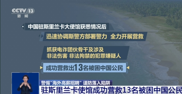 中国驻斯里兰卡大使馆获悉情况后,迅速协调斯警方部署警力,全力开展营救,抓获电诈团伙骨干及涉及非法伤害、非法拘禁的犯罪嫌疑人,成功营救出13名被困中国公民。