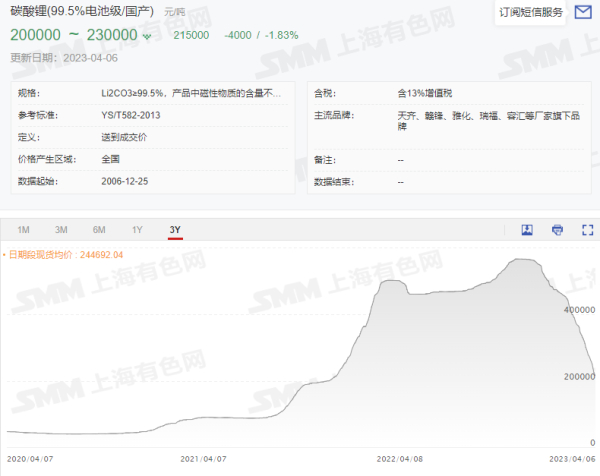 截至4月6日,上海有色网数据显示,作为行业风向标的国产电池级碳酸锂(99.5%)报价21.5万元/吨,今年年内,碳酸锂价格累计跌幅已接近60%。