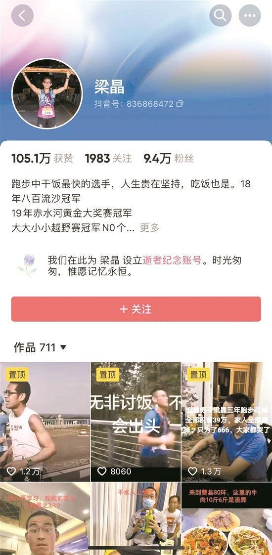 国内越野跑顶尖选手梁晶2021年在甘肃白银马拉松越野赛中不幸遇难。他的抖音有9.4万粉丝,发布的711个作品几乎都是自己的比赛和训练日常。目前,梁晶的抖音个人主页已出现缅怀标志:“我们在此为梁晶设立逝者纪念账号。时光匆匆,惟愿记忆永恒。”——2021年,抖音为30位用户设立逝者纪念账号,这就是其中之一。