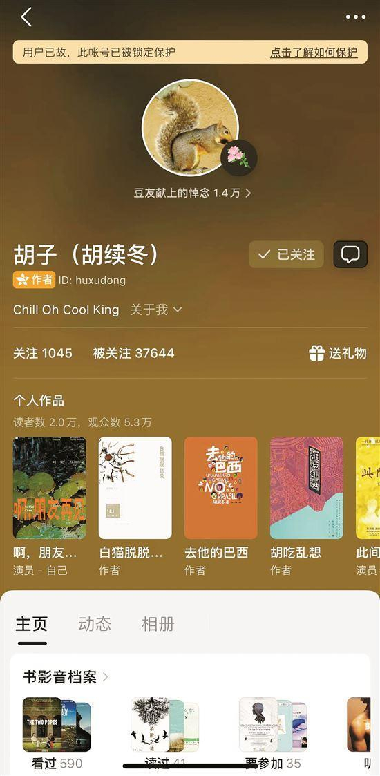 胡续冬在豆瓣上的代号是“胡子”,2021年8月因病去世,生前是大学教授兼诗人,十分热爱诗歌。进入豆瓣App上他的主页,你会看到“用户已故,此账号已被锁定保护”的字样。主页头像下面一个鲜花的按钮已经被点击了超过1.4万次,点开“前来悼念的豆友”,就在几分钟前,刚刚有人“放了一束山茶”;往下拉,可发现几乎每天都有几十束山茶被奉上。
