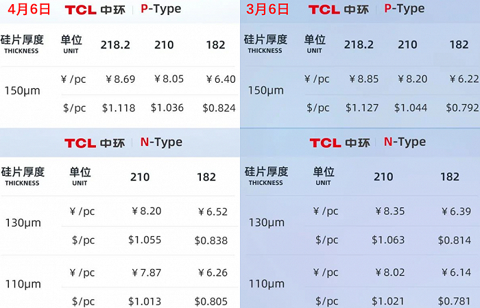 4月6日,TCL中环更新了单晶硅片报价。与3月6日报价相比,P型182mm硅片上涨2.89%;210mm硅片下跌1.83%,N型182硅片上涨2.03%,N型210硅片下跌1.8%。