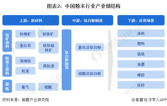钛白粉产业链上游为原材料,包括钛铁矿、钛精矿、金红石、钒钛磁铁矿等;中游即为钛白粉产品,按照使用的提炼方式分为氯化法钛白粉和硫酸法钛白粉;下游为钛白粉的应用领域,钛白粉广泛应用于涂料、塑料、造纸、油墨、橡胶等多个领域。