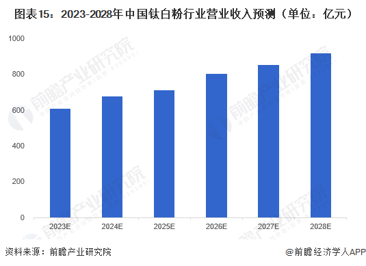 钛白粉产量、产能继续保持增长趋势下产能集中度进一步提高,钛白粉行业正在经历调整转型升级阶段,行业内部大力推进氯化法生产钛白粉,对过去已经建成的生产线进行数字化、节能化、绿色化改造,过程中势必会对行业增速带来一定影响,行业预期将以平稳速度增长。预计到了2028年中国钛白粉行业市场规模达到920亿元,年均符合增长率为8.5%。