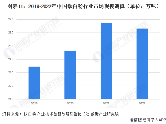 近年来中国钛白粉的价格变动呈现增长趋势,从2019年约13350元/吨增长至2021年约20200元/吨,但在2022年中国钛白粉均价有所回落,约18890元/吨。根据中国钛白粉表观需求量情况和中国钛白粉均价情况综合测算,2022年中国钛白粉的市场规模约为497亿元。