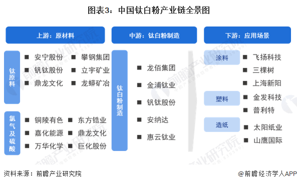 从钛白粉产业链的参与企业上看,上游参与企业主要有安宁股份、东方锆业、立宇矿业等等;中游钛白粉制造企业主要包括龙佰集团、金浦钛业、钒钛股份、安纳达等;下游应用领域企业主要包括飞扬科技、三棵树等涂料企业,金发科技、普利特等塑料制造企业,太阳纸业、山鹰国际等造纸企业。