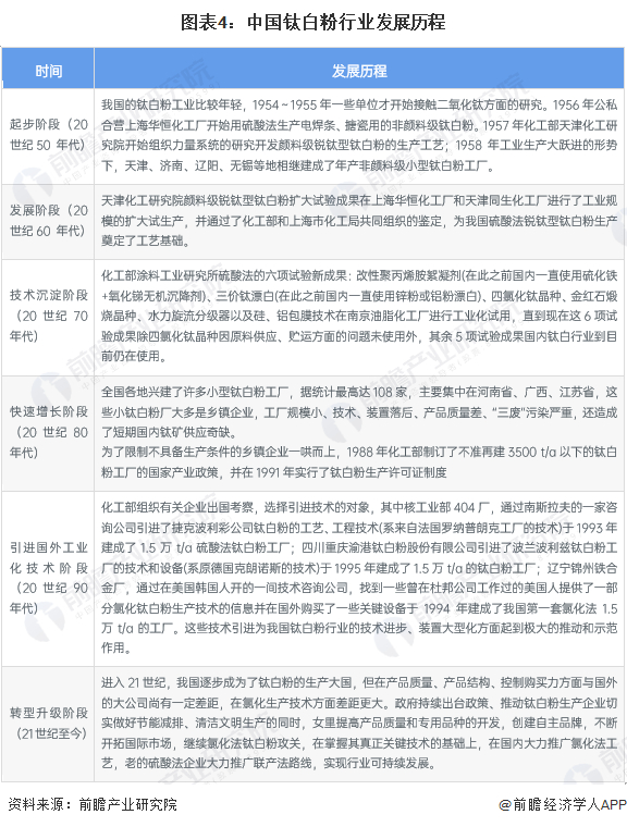 目前,我国钛白粉行业已形成完整、合理的产业体系,同时我国开始对化工产业节能环保方向转型,整体来看中国钛白粉发展历程可概括为以下六个阶段:
