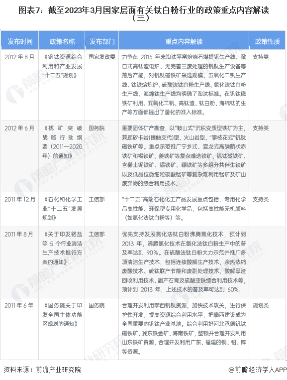 钛白粉行业相关政策在2011-2013年期间出台较多,政策类型多为关键技术突破、支持钒钛磁铁矿综合利用等。近年来,伴随着该化工产品关键技术逐步突破,政策导向往环保发展转型,如鼓励这些资源高质化利用,提升深加、提升工业水效等环节。