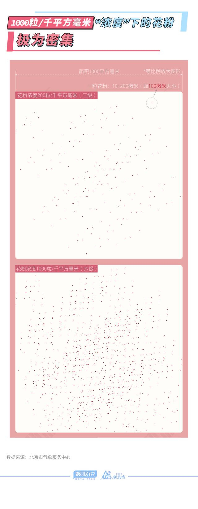 北京市气象服务中心今年发布花粉指数,将花粉浓度分为6个等级,依次为“很低”“较低”“偏高”“较高”“很高”“极高”,其中,“极高”意味着每千平方毫米花粉浓度高于800粒,“很高”意味着每千平方毫米花粉浓度在500-800粒之间。