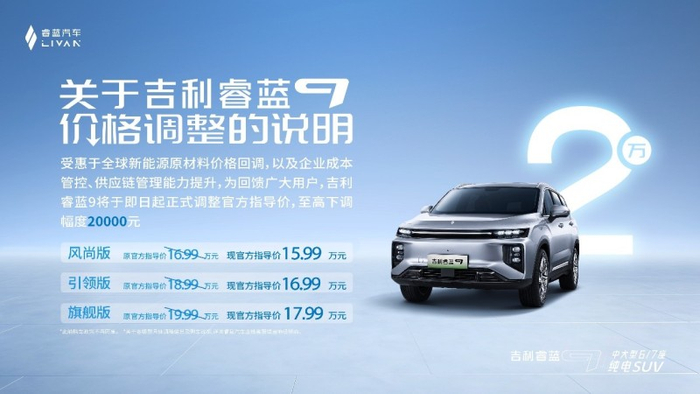此次调整中,睿蓝9风尚版下调10,000元后售159,900元,其搭载52.56kW·h电池包,CLTC续航380km;睿蓝9引领版下调20,000元后售169,900元,搭载66.57kW·h电池包,CLTC续航470km;睿蓝9旗舰版下调20,000元后售179,900元,搭载66.57kW·h电池包,CLTC续航470km。
