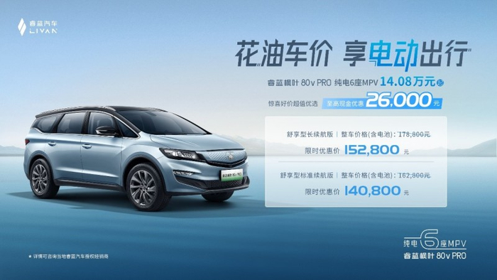 作为睿蓝旗下纯电大6座MPV,枫叶80v PRO至高现金优惠26,000元,仅需140,800元。枫叶80v PRO舒享型长续航版原价格(含电池)178,800元,现金优惠26,000元,限时优惠价152,800元;枫叶80v PRO舒享型标准续航版原价格(含电池)162,800元,现金优惠22,000元,限时优惠价140,800元。