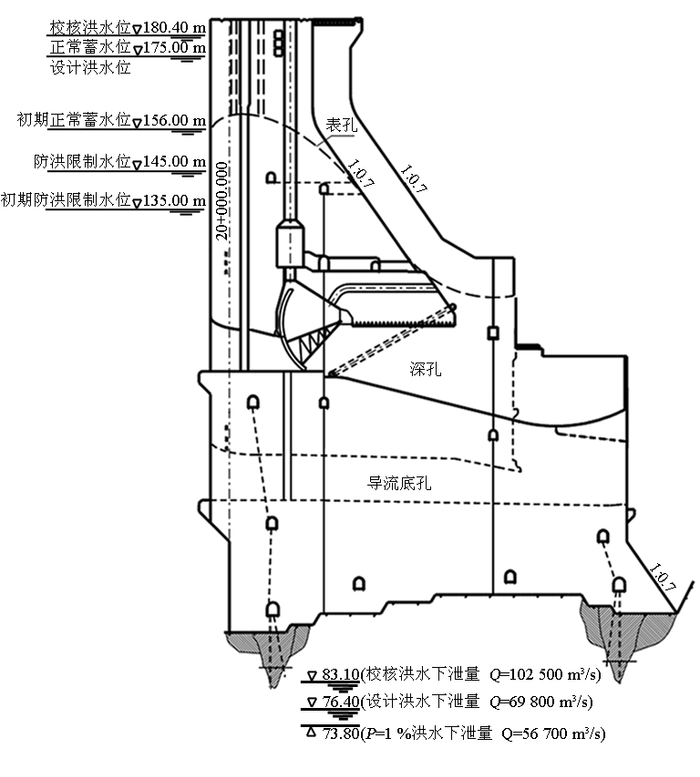 泄洪坝段具有孔口多、尺寸大,泄洪设备闸门井多,结构复杂;导流底孔和泄洪深孔泄流量大、流速高、汛期运用时间长,抗冲耐磨要求高;单个坝段长度为 21 m,最大坝底宽达 126.7 m,坝段结构分缝和混凝土温度控制要求高等特点。因此,泄洪坝段设计中重点需解决水力设计、大孔口设计和坝体结构分缝及其温度控制设计等问题。