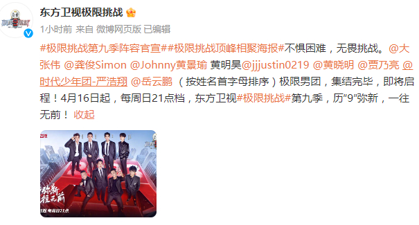 今(9)日,综艺节目《极限挑战》第九季官宣阵容,大张伟、龚俊、黄景瑜、黄明昊、黄晓明、贾乃亮、严浩翔、岳云鹏组成极限男团。4月16日起,每周日21点档播出。