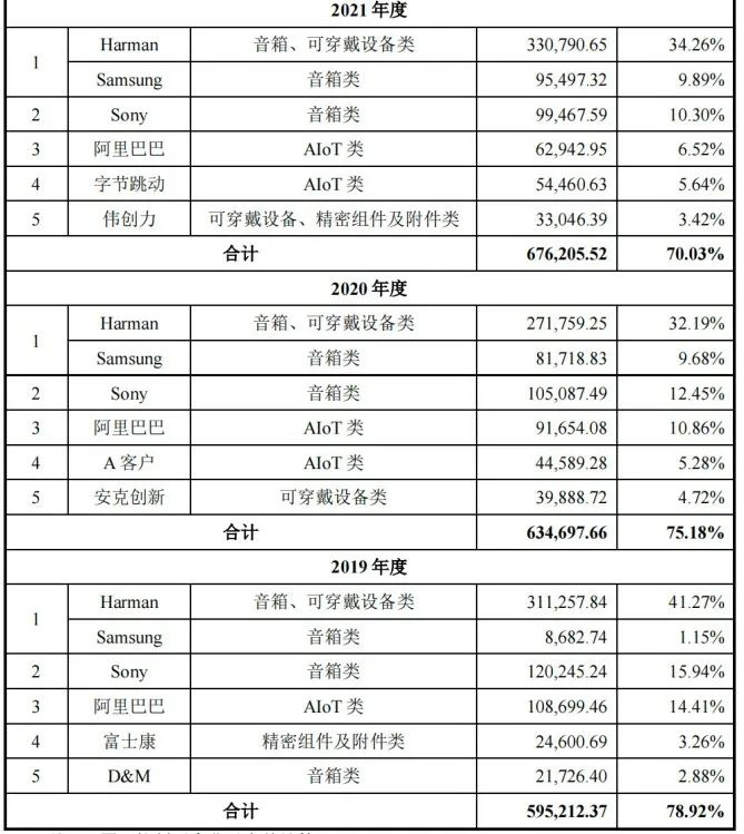 对比同行华勤技术、闻泰科技、歌尔股份、佳禾智能。2019年至2021年,行业前五大客户销售占比的平均值分别为79.64%、79.60%、75.10%,与通力股份接近。