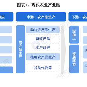 中国现代农业领域上游由研发、农资供应两大环节组成,为现代农业产业的运行提供基础的环境;现代农业中游主要由动物、植物农产品生产构成。在下游的应用环节中,主要分为农产品深加工及农产品流通两大环节。