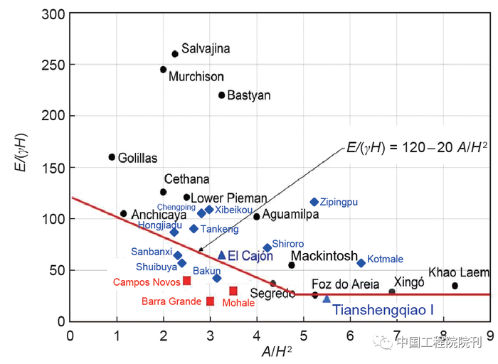 现代面板堆石坝建设自1965年开始,以Cooke为代表,强调依据经验设计、小吨位振动碾薄层碾压施工。中国在20世纪80年代开始引进现代面板堆石坝技术,并在之后的发展中结合控制面板结构性裂缝,中国和巴西专家提出大坝变形控制的理念并将其应用于水布垭、洪家渡等工程。中国提出了孔隙率控制的严格指标,采用更大激振力的碾压设备,将堆石料的孔隙率控制在19%~20%,大坝最大沉降变形控制在1%坝高,具体见表4。Pinto认为提高堆石体压缩模量E对减小面板压应变是最有效的,并建立了堆石坝体变形模量E/(γH)与河谷形状因数A/H2的关系(图7)。上述认识和实践促进了面板堆石坝的发展。